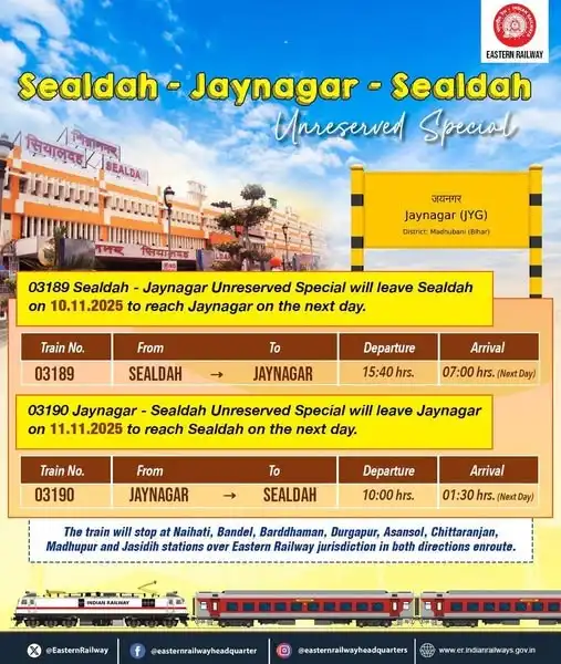 ইতিমধ্যে এই বিশেষ অসংরক্ষিত স্পেশাল ট্রেনের সম্পর্কে বিজ্ঞপ্তি জারি করেছে পূর্ব রেল। এই বিজ্ঞপ্তি অনুযায়ী, ০৩১৮৯ শিয়ালদা জয়নগ সোমবার বিকেল ১৫:৪০টা মিনিটে হাওড়া থেকে ছাড়বে। এরপর সেই ট্রেনটি পরের দিন সকাল ৭টা নাগাদ বিহারের জয়নগরে পৌঁছাবে। এরপর ফিরতি পথে ট্রেন নম্বর ০৩১৯০ জয়নগর-শিয়ালদা অসংরক্ষিত স্পেশাল ১১ নভেম্বর সকাল ১০টার সময়ে জয়নগর থেকে ছাড়বে এবং এরপর সেটি শিয়ালদা ঢুকবে পরের দিন রাত ১:৩০টার সময়ে।