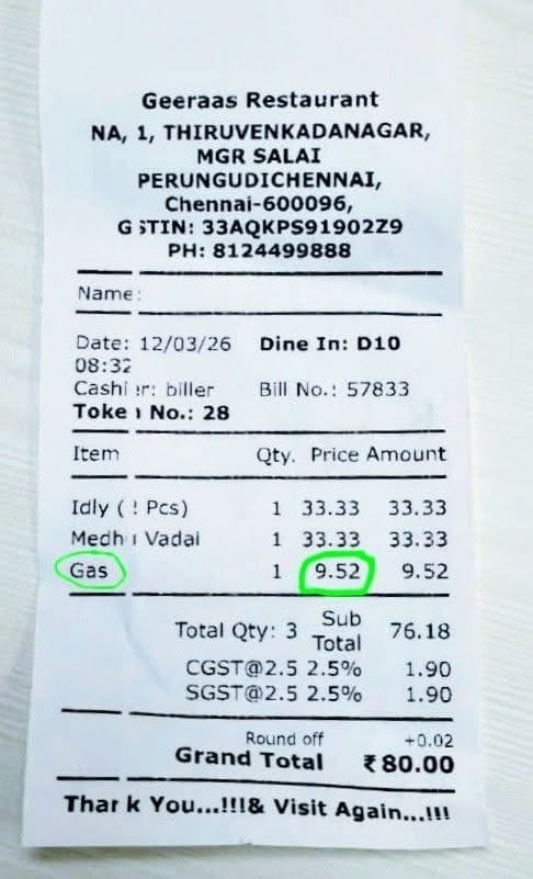 রেস্তোরাঁর মালিকরা দাবি করছে, বর্তমানে বাণিজ্যিক রান্নার গ্যাসের দাম আর সরবরাহ দুটোই অনিশ্চিত। এই কারণে অনেক জায়গায় রেস্তোরাঁগুলিকে অতিরিক্ত খরচ করতে হচ্ছে। পাশাপাশি কিছু কিছু রেস্তোরাঁ বা হোটেল গ্যাসের অভাবে বন্ধ হয়ে গিয়েছে। আর সেই খরচ সামাল দেওয়ার জন্যই কিছু রেস্তোরাঁ গ্রাহকদের বিলের মধ্যে গ্যাস ফি বা এলপিজি সারচার্জ নামে আলাদা চার্জ যুক্ত করছে। সম্প্রতি সোশ্যাল মিডিয়ায় একটি বিল ভাইরাল হয়েছে। আর সেখানে Geeraas Restaurant নামে একটি রেস্তোরাঁ গ্রাহকের বিলের সঙ্গে ৯.৫২ টাকা গ্যাস ফি যুক্ত করেছে। বিষয়টি সামনে আসার পর অনেকেই প্রশ্ন করেছেন, এই ধরনের অতিরিক্ত চার্জ নেওয়া ঠিক কতটা যুক্তিযুক্ত?