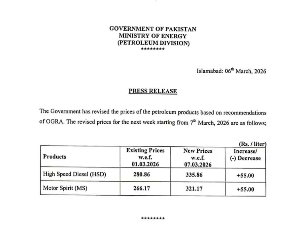 শুক্রবার পাকিস্তানের পেট্রোলিয়াম মন্ত্রী আলী পারভেজ মালিক, উপ-প্রধানমন্ত্রী ইসহাক দার এবং অর্থমন্ত্রী মুহাম্মদ আওরঙ্গজেব এক সাংবাদিক সম্মেলনে নতুন দাম ঘোষণা করেন। এগুলি ৭ মার্চ, ২০২৬ থেকে অর্থাৎ আজ থেকে কার্যকর হবে। আজ থেকে পাকিস্তানের পেট্রোল প্রতি লিটারে ২৬৬.১৭ টাকা থেকে বেড়ে ৩২১.১৭ টাকা হয়েছে। এছাড়া হাই স্পিড ডিজেল প্রতি লিটারে ২৮০.৮৬ টাকা থেকে বেড়ে ৩৩৫.৮৬ টাকা হয়েছে।