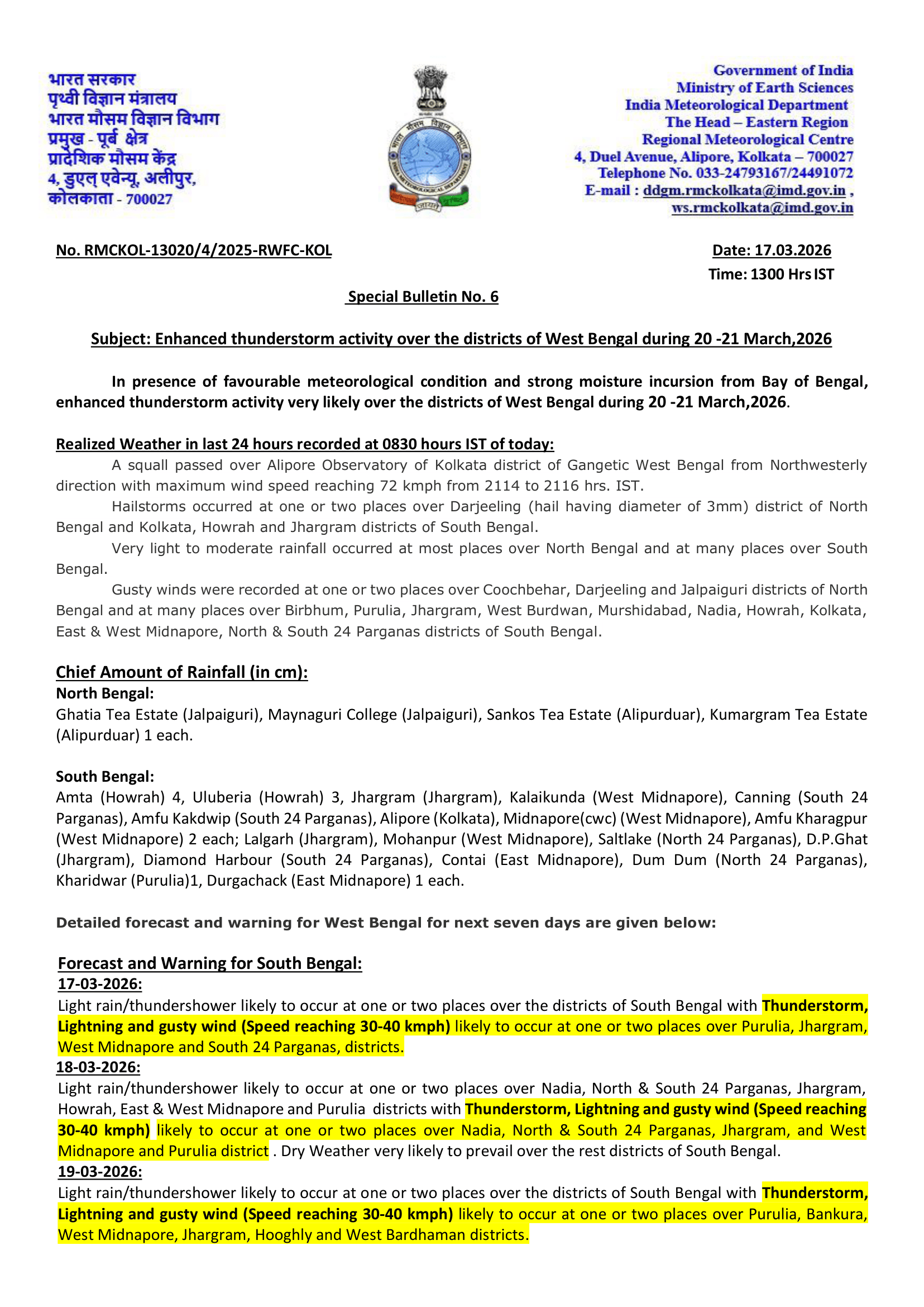 আইএমডি কলকাতা জানিয়েছে, বায়ুমণ্ডলের নিম্ন স্তরে অনুকূল বায়ুপ্রবাহ এবং বঙ্গোপসাগর থেকে প্রবল আর্দ্রতার প্রবেশের কারণে ২২শে মার্চ পর্যন্ত রাজ্যের বিভিন্ন জেলায় বজ্রবিদ্যুৎ সহ তুমুল ঝড় বৃষ্টি হওয়ার জোরালো সম্ভাবনা রয়েছে।