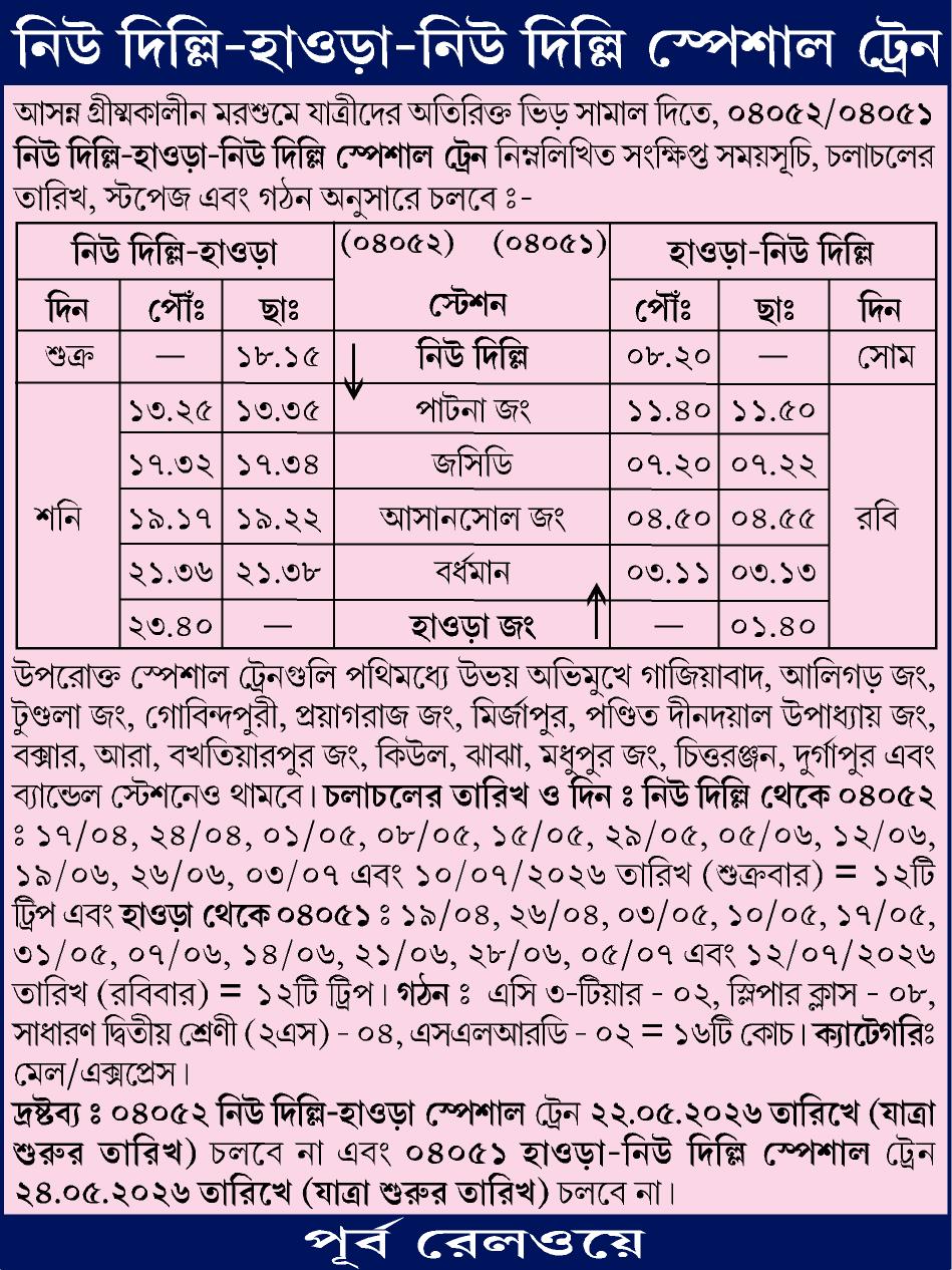 আরও ভালোভাবে বললে, উপরোক্ত স্পেশাল ট্রেনগুলি গাজিয়াবাদ, আলিগড় জং, টুন্ডলা জং, গোবিন্দপুরী, প্রয়াগরাজ জং, মির্জাপুর, পণ্ডিত দীনদয়াল উপাধ্যায় জং, বক্সার, আরা, বক্সারিয়ারপুর জং, কিউল, ঝাঝা, মধুপুর জং, চিত্তরঞ্জন, দুর্গাপুর এবং বাণ্ডেল স্টেশনেও থামবে। ০৪০৫২ নয়াদিল্লি থেকে ১৭ এপ্রিল, ২৪ এপ্রিল, ১ মে, ০৮ মে, ১৫ মে, ২২ মে, ৫ জুন, ১২ জুন, ১৯ জুন, ২৬ জুন , ৩ জুলাই এবং ১০ জুলাই অর্থাৎ ১২টি ট্রিপ চলবে।