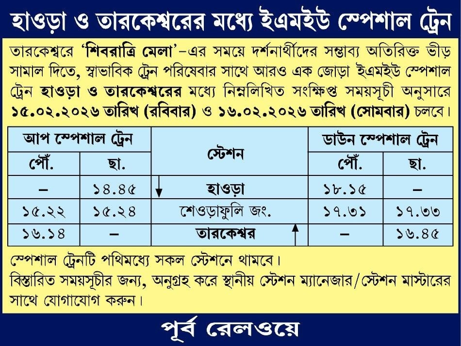 পূর্ব রেলে তরফে জারি করা বিজ্ঞপ্তি অনুযায়ী তারকেশ্বরের শুভরাত্রি মেলার সময় দর্শনার্থীদের সম্ভাব্য অতিরিক্ত ভিড় সামাল দিতে স্বাভাবিক ট্রেন পরিষেবার সাথে আরো একজোড়া লোকাল ট্রেন চালানো হবে। আর এই ট্রেনটি হাওড়া ও তারকেশ্বরের (Howrah-Tarkeshwar Local Train) মধ্যে। হ্যাঁ একদম ঠিক শুনেছেন।