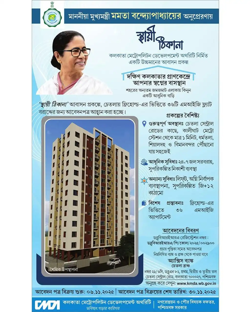 মূলত মুখ্যমন্ত্রী মমতা বন্দ্যোপাধ্যায়ের উদ্যোগে এবং অনুপ্রেরণায় ‘স্থায়ী ঠিকানা’ (Sthayi Thikana) নামের কলকাতা মেট্রোপলিটোন ডেভেলপমেন্ট অথরিটি নির্মিত একটি উচ্চমানের আবাসন প্রকল্প। এই প্রকল্পের আওতায় চেতলায় ফ্রিহোল্ড-এর ভিত্তিত্যে ৩৬টি এমআইজি ফ্ল্যাট বরাদ্দের জন্য আবেদনপত্র আহবান করা হচ্ছে সকলের কাছে।