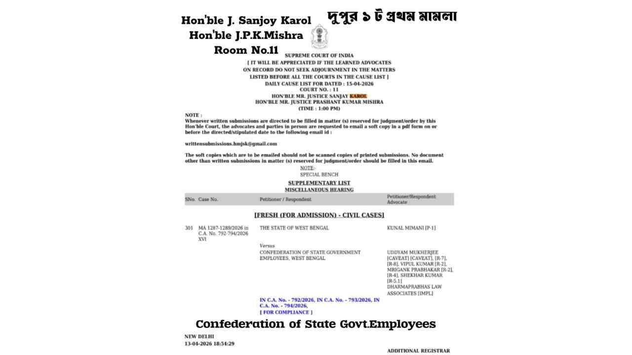 এদিন শীর্ষ আদালতের বিচারপতি সঞ্জয় করোল এবং বিচারপতি প্রশান্ত কুমার মিশ্রের বেঞ্চে মামলাটির শুনানি হবে। ওই দিন দুপুরে রাজ্যের আবেদনটি উঠবে দুই বিচারপতির বেঞ্চে বলে সূত্রের খবর। এমনিতেই সকলের ডিএ মেটাতে গিয়ে পশ্চিমবঙ্গ সরকারের কয়েক হাজার কোটি টাকা খরচ হবে বলে জানানো হয়েছিল। সেই সঙ্গে সামনে রয়েছে ভোট, তারওপর কেন্দ্র সরকারের তরফে কোনো রকম আর্থিক অনুদান দেওয়া হচ্ছে না বলে অভিযোগ। ফলে যথেষ্টের মধ্যে রয়েছে পশ্চিমবঙ্গ সরকার বলে ধারণা করা হচ্ছে।
